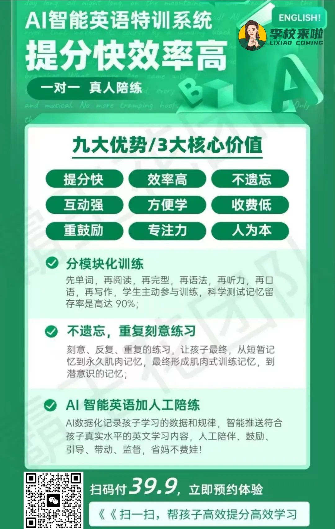 小学、初中、高中、大学各阶段学生,尤其助力中考、高考、大学英语四六级,甚至雅思托福。扫码预约体验一次,就知道效果佳!最关键不费妈!