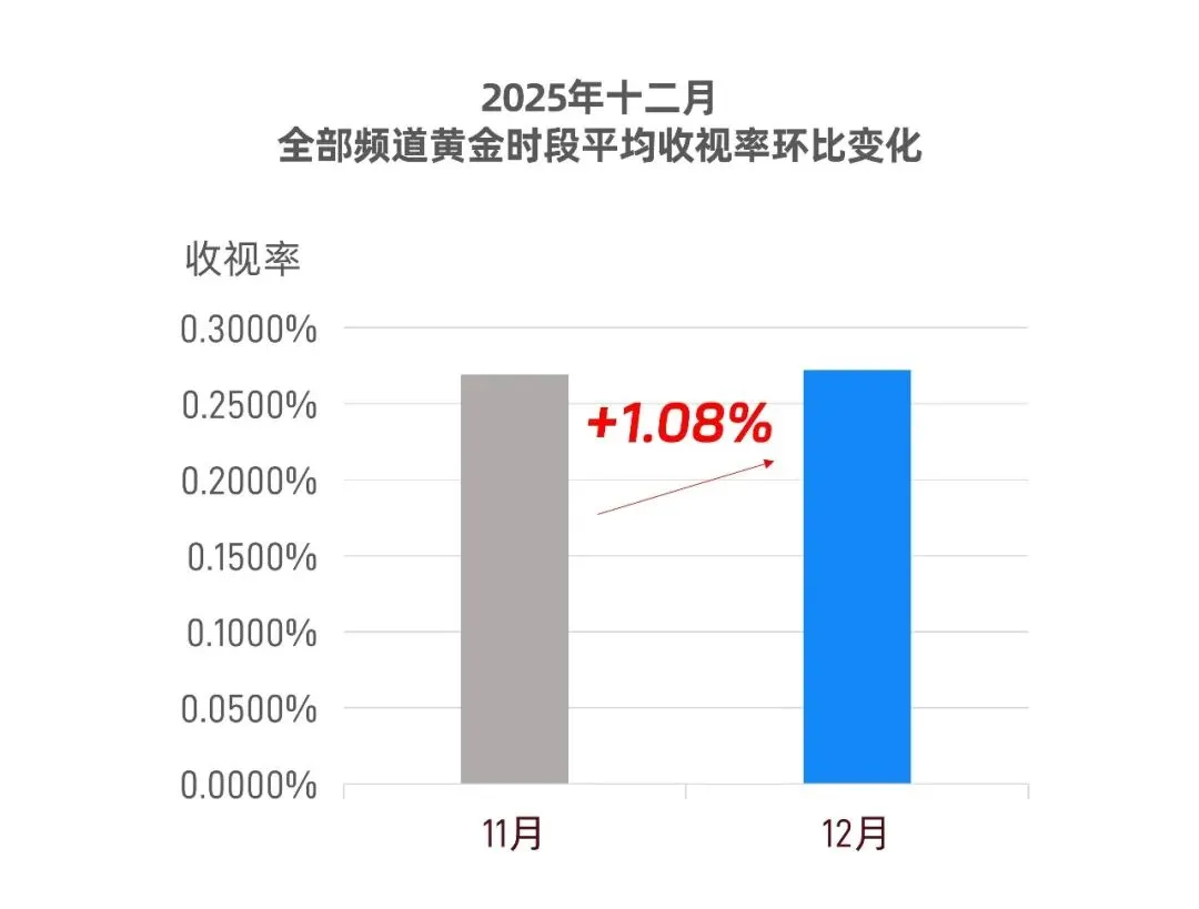 湖南卫视收视率0.3624%,位列省级卫视黄金时段平均收视率第一;浙江卫视收视率0.3357%位列12月省级卫视黄金时段平均收视率第二;北京卫视12月黄金时段平均收视率0.2511%位列第三名。