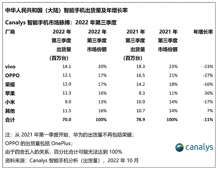 10月27日,第三方市场机构Canalys发布了2022年第三季度中国大陆智能手机市场报告。报告显示,三季度中国大陆智能手机出货量达7000万台,相比二季度有所改善,但市场仍在低位徘徊,同比下跌11%。