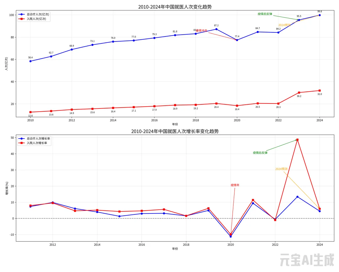(注:1.本文“医疗行业”指医疗服务为代表的大行业,类似于“医改”的界定,着眼于整个社会医疗需求与供给的复杂关系。2.数据来自卫健委、医保局,使用AI工具整理;)