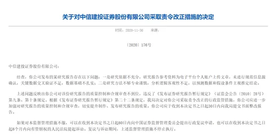 今日,北京证监局网站发布了一则《关于对中信建投证券股份有限公司采取责令改正措施的决定 》。《决定》显示,此次中信建投吃到罚单的主要原因为发布的某研究报告存在研究依据不充分、研究方法不够专业谨慎等问题。无独有偶,就在11月初,申万宏源也同样因为在研报发布前的质量控制和合规审查上出现问题而吃到上海证监局的罚单。