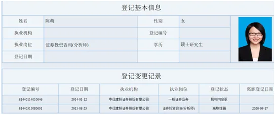 另据证券业协会网站显示,中信建投前海外首席分析师陈萌已今年9月中旬从公司离职,不过目前还没有她在其他券商任职的信息。