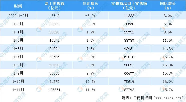 据国家统计局数据显示,2020年1—11月份,全国网上零售额105374亿元,同比增长11.5%。其中,实物商品网上零售额87792亿元,占社会消费品零售总额的比重为25%。