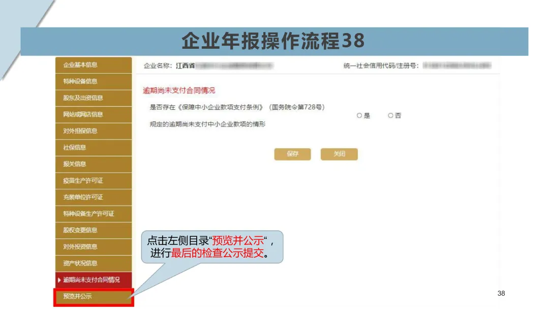 10,按照顺序填写企业基本信息至结尾(填写错误界面会有提示,按提示修改),点击预览并公示