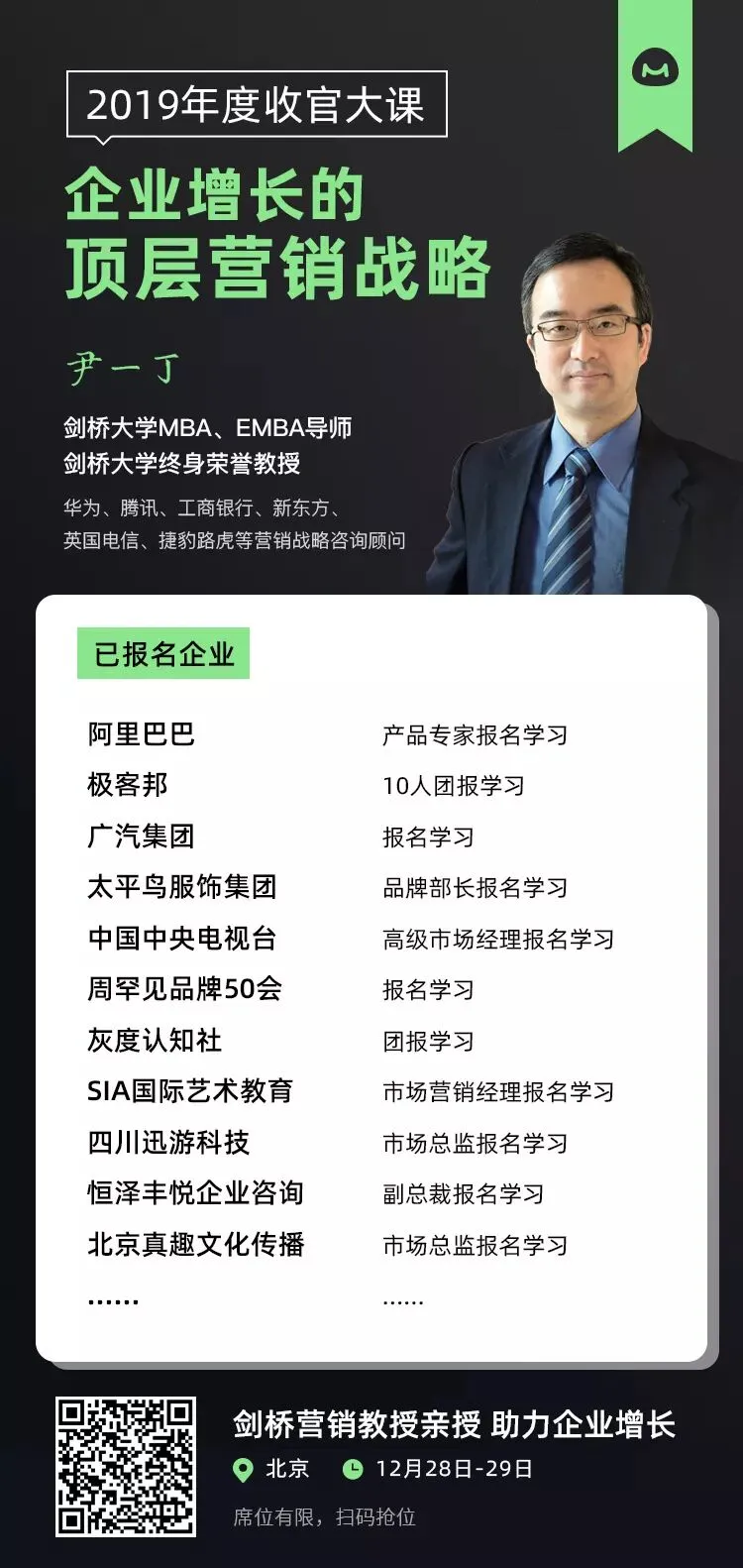 这正是2019年馒头商学院年度收官大课《企业增长的顶层营销战略》要解决的核心问题,为此馒头商学院请来了多年来一直在剑桥大学嘉治商学院讲授MBA和EMBA的营销战略和品牌管理课程的尹一丁教授,为大家带来为期2天的实战课程。