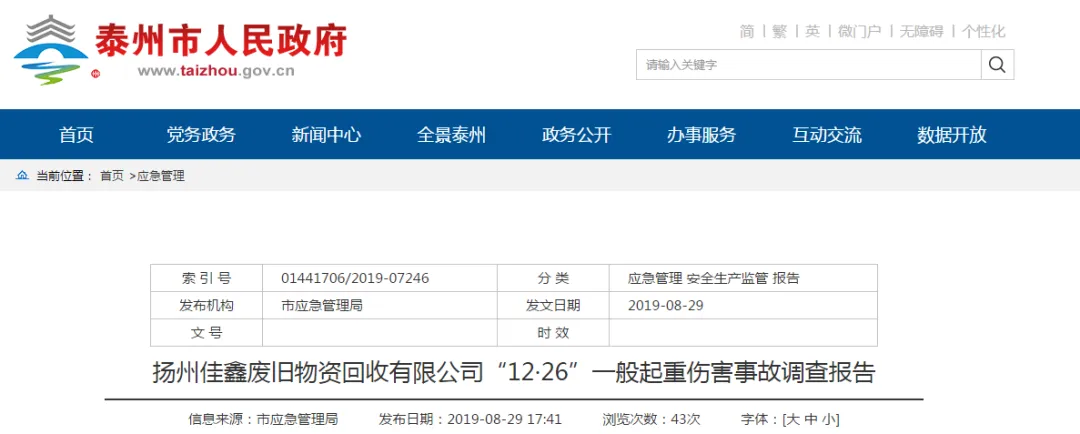 近日,江苏泰州市人民政府公布了该起事故的调查报告。