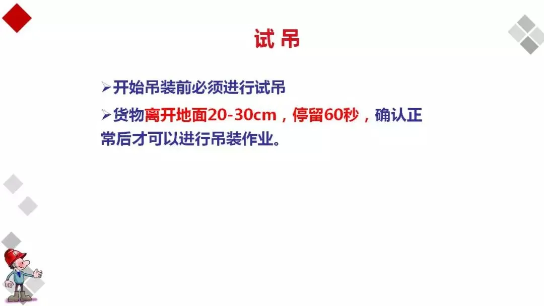 起吊前应先检查吊物的平衡性和绑扎的牢固性,确认无误后,方可起吊,吊物捆扎不牢严禁起吊。