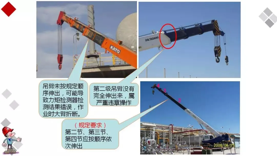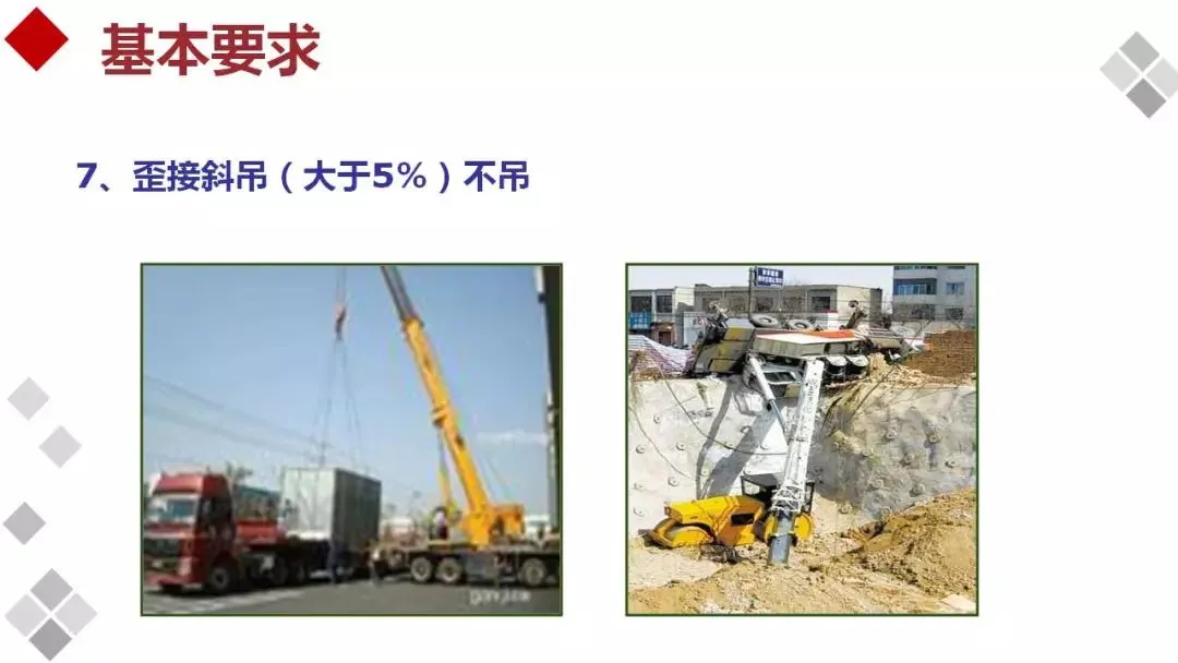 起吊的构件应确保在起重机吊杆顶的正下方,严禁采用斜拉、斜吊。