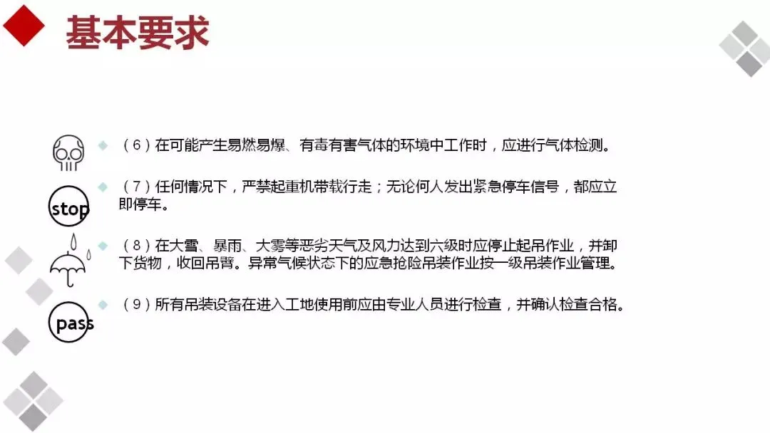 大雨天、雾天、大雪天及六级以上大风天等恶劣天气应停止吊装作业。