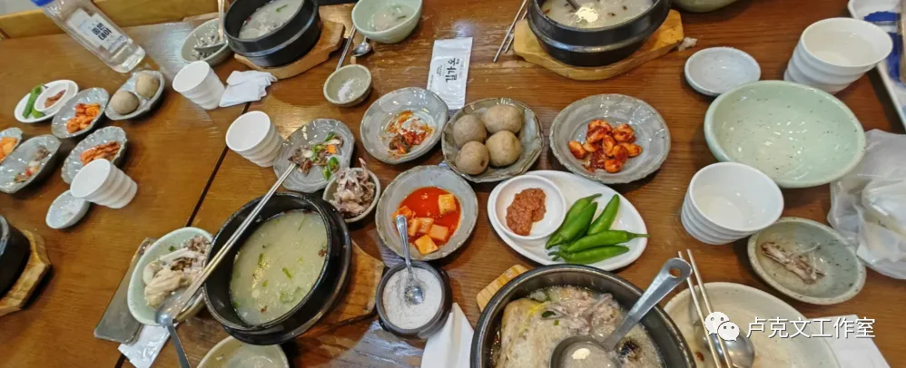 另外被韩国人吹上天的参鸡汤,我在釜山采访那位黑道大哥时,吃的就是这个,其实还是汤泡饭,不过是煮熟的整只鸡,汤里配几片人参和大米,鸡肉完全没有味道,辅食搭配的居然是整只生辣椒、煮熟的土豆、泡菜等,真的不知道为什么算当地美味。
