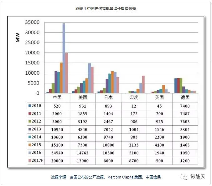 2016年是全球光伏装机增长的一个里程碑。据德国太阳能协会最新发布的统计数据显示,2016年全球光伏新增装机70GW,比2015年增长大约30%,至此,全球光伏装机总量达到300GW。在2016年的新增装机量中,中国贡献了34.54GW,与2015年新增装机量相比,同比增长了128%,累计装机容量77.42GW,新增和累计装机容量均为全球第一。美国2016全年光伏装机14.76GW,装机量同比增长97%,其中公共事业装机量起到了主要的拉动作用。