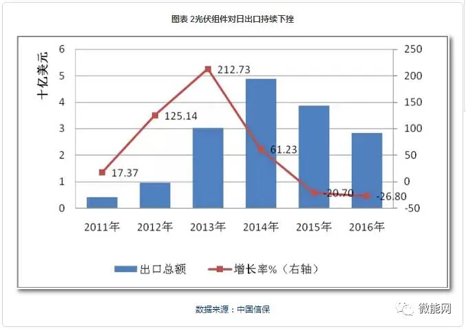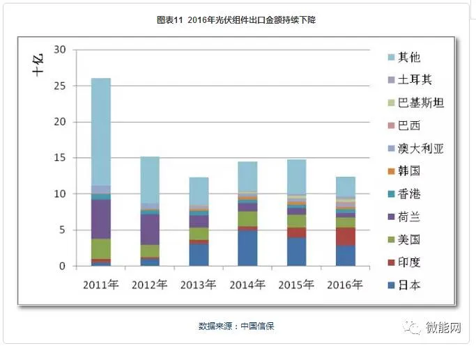 日本仍为我国光伏组件出口的第一大市场,但2016年,我国对日光伏组件出口金额28.34亿美元,较2015年同比下滑26.80%。