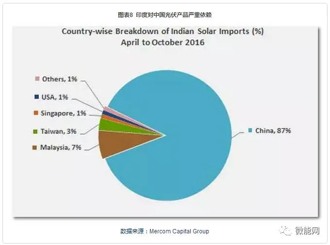 在我国光伏组件对印出口大幅上升的同时,印度光伏行业对中国产品的依赖度也在上升,据印度商务部统计,在2016年4-10月期间,在印度光伏产品进口来源国中,中国产品已经占据了87%的市场,其次为马来西亚,但占比仅7%,排在第三位的中国台湾,占比也仅有3%。