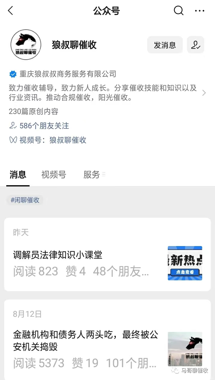 基本上他的公众号一更新我都会去看,里面干货不少,包括我们行业最前沿的一些资讯,催收故事,催收技巧方面的文章,并且不定期还有直播(由狼叔和旗下唐老师开播,答疑解惑)