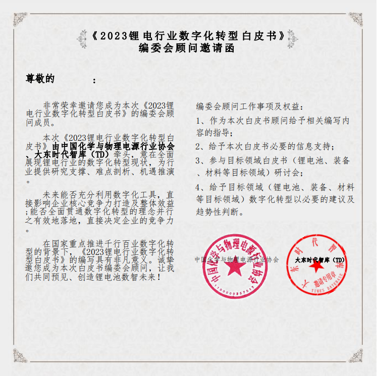 《2023锂电行业数字化转型白皮书》编委会顾问通知