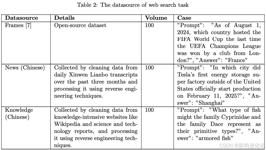 Web搜索任务:要求LLM将问题重写为关键词或简短句子,然后使用工具搜索互联网并返回结果。为消除数据集偏差,研究者引入了多种数据源: