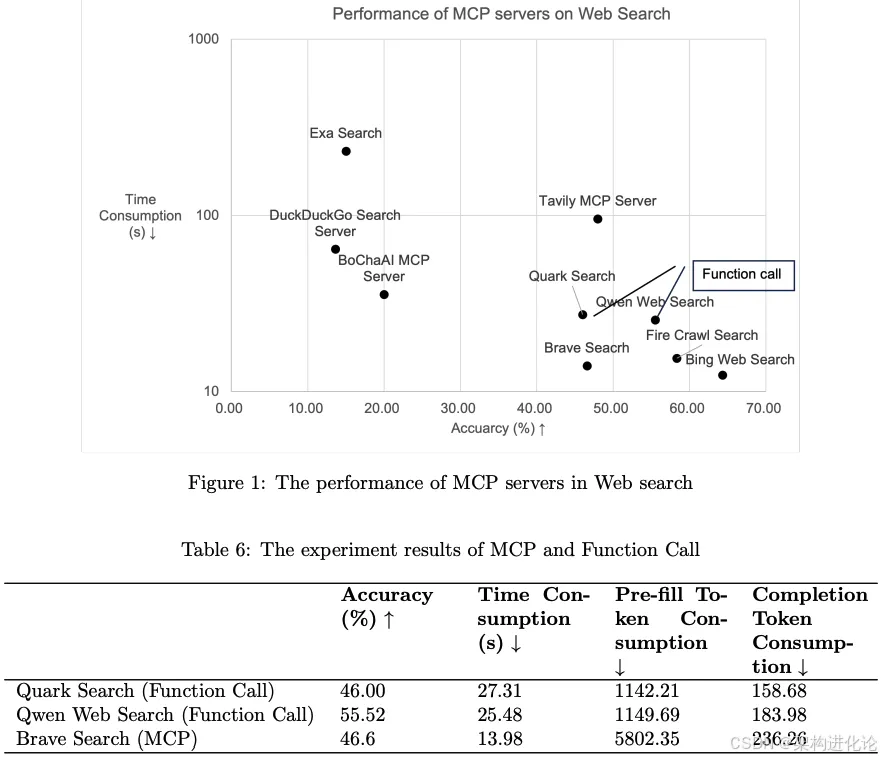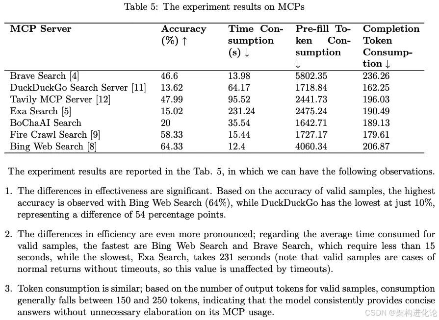 性能差异:不同MCP服务器在效果和效率方面存在显著差异,从Bing Web Search的64%准确率到DuckDuckGo的仅13.62%