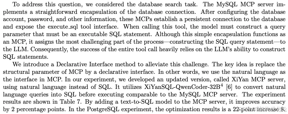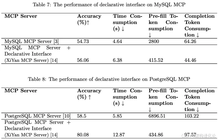 研究者使用SQL_EVAL数据集评估了PostgreSQL MCP Server和XiYan MCP Server在数据库搜索任务上的性能差异: