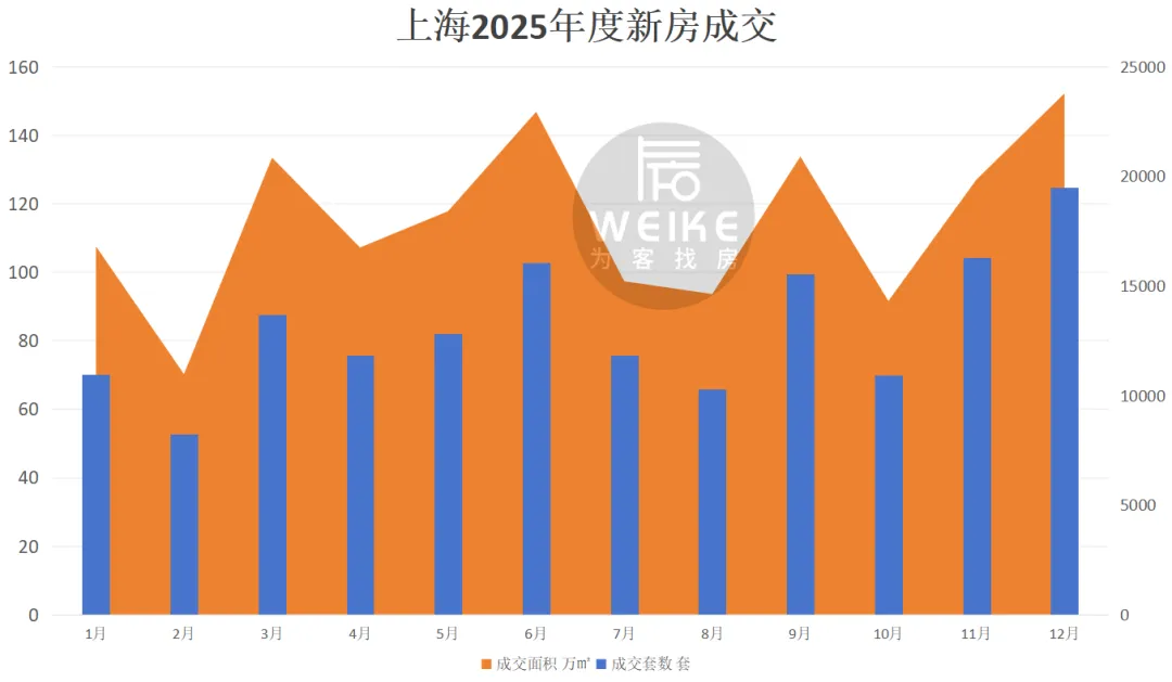 据为客找房统计:上海各区一手房2025年度共计备案成交157815套,成交面积1378万㎡。