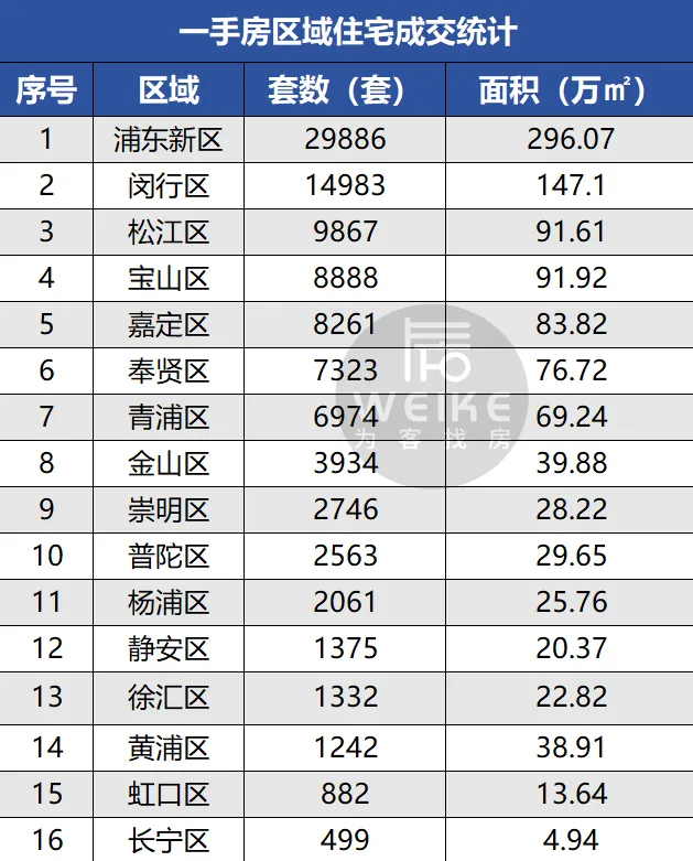 一手房区域住宅成交统计TOP16榜单中,浦东新区成交29886套,成交面积296.07万㎡,销量第一。闵行区成交14983套,成交面积147.1万㎡,排名第二,松江区成交9867套,成交面积91.61万㎡,排名第三。