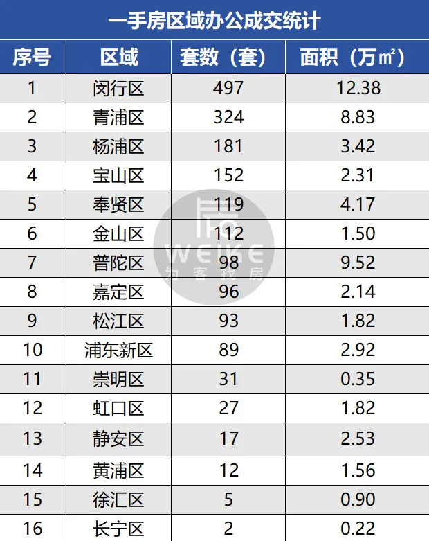 一手房区域办公成交统计TOP16榜单中,闵行区成交497套,成交面积12.38万㎡,销量第一。