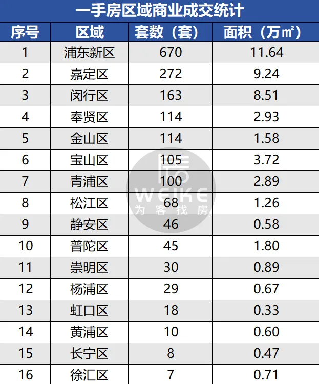 一手房区域商业成交统计TOP16榜单中,浦东新区成交670套,成交面积11.64万㎡,销量第一。