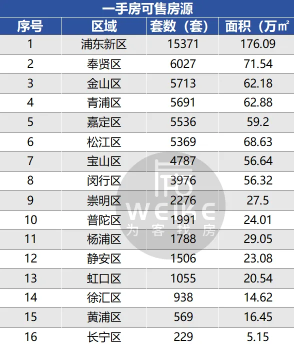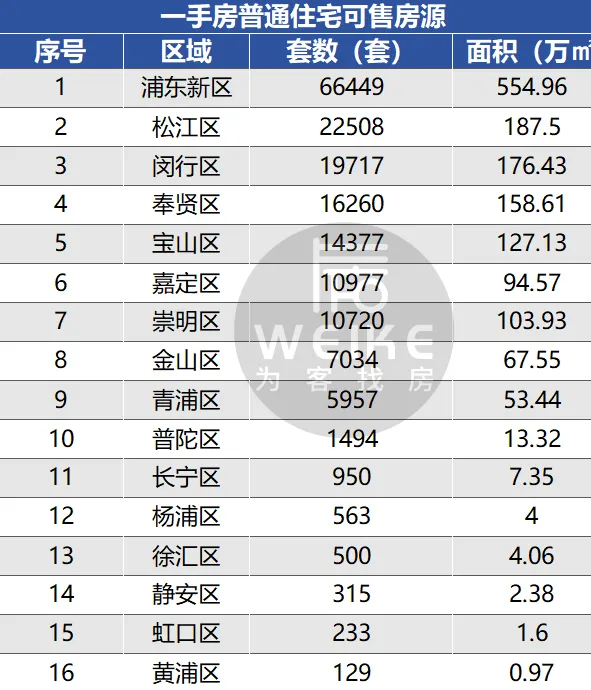 一手房普通住宅可售房源统计中,浦东新区可售房源66449套,面积554.96万㎡,排名第一。松江区可售房源22508套,面积187.5万㎡,排名第二,闵行区可售房源19717套,面积176.43万㎡。