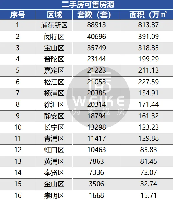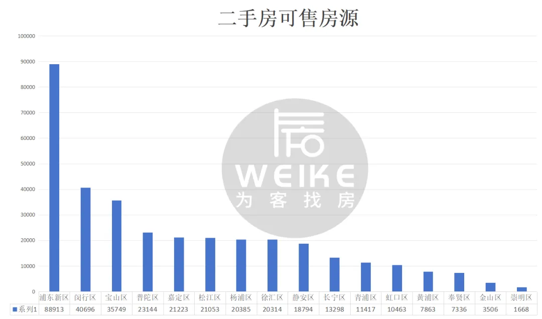 二手房普通住宅可售房源统计中,浦东新区可售房源88913套,面积813.87万㎡,排名第一。闵行区可售房源40696套,面积391.09万㎡,排名第二,宝山区可售房源35749套,面积318.85万㎡。