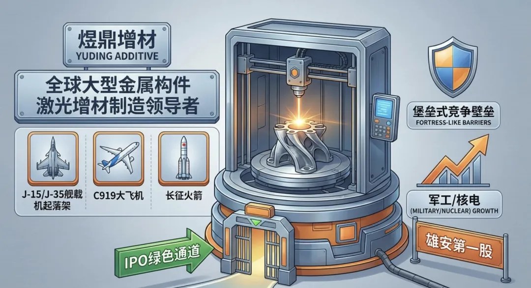 煜鼎增材深度行业分析报告01 执行摘要 煜鼎增材是全球大型金属构件激光增材制造(3D金属打印)的绝对领导者,拥有国际唯一突破并量产化的送粉激光成形技术。 公司掌握10余款"大国重器"关键部件的唯一供应权,包括歼15/歼35舰载机起落架、C919大飞机、长征火箭等,工程应用验证已长达20年。凭借技术全球唯一性、极高的客户粘性和"卡脖子"产品属性,公司形成了堡垒式竞争壁垒。当前军工基本盘稳定增长,民用市场(特别是核电领域)开始快速扩张,预示未来3-5年将进入爆发期。 同时,公司已获雄安新区和国家发改委双通道推荐至IPO绿色通道,目标成为"雄安第一股",上市确定性极强。 02 行业市场空间:全球增长动力与中国机遇 1.1 全球市场规模与增长态势 2024年全球3D打印市场规模已达219亿美元,预计2025年增长至240亿美元,2030年将达627亿美元,整体复合年增长率达14.34%。 更值得关注的是,金属增材制造作为产业内最高端、增速最快的细分领域,2019-2024年复合年增长率达27.23%,远高于行业平均水平。 这反映了工业级应用从"可选项"向"必选项"转变的趋势,特别是在航空航天、核电、能源等高端制造领域。 1.2 中国市场:全球增长引擎 中国3D打印市场呈现出"增速领先全球"的显著特征。 2024年中国3D打印行业市场规模达423亿元,同比增长15.26%,增速显著高于全球平均水平;预计2025年将突破500亿元。 更关键的是,2024年中国金属基3D打印材料市场规模约50亿元,预计2025年增长至65.3亿元,显示工业级应用占比持续提升。 亚太地区成为全球增长最迅猛的区域,预计2025-2030年复合年增长率达28.6%,其中中国贡献该地区76%的增量需求。 2024年前三季度,中国3D打印设备产量同比增长25.4%,出口金额达63.3亿元,显示出强劲的国际竞争力。 1.3 细分应用市场:战略性需求驱动 航空航天领域 是金属增材制造的最主要应用场景。 全球航空航天领域的金属增材制造市场规模预计到2030年超过300亿美元。 对中国而言,虽然现役军机数量已位居世界第三,但绝对规模仅为美国的1/4,存在巨大的补齐空间;同时新机型占比、装备列装周期提速,都带来持续的需求增长。 核电领域 是煜鼎增材最新开拓的民用市场,蕴含最直接的商业化机会。 承压炉(反应堆压力容器)制造中,煜鼎是国内唯一可以3D打印的企业,已获中核动力院数千万元订单,预计未来年订单规模3-5亿元。按2025年全球核电市场规模推算,承压容器及相关设备年市场约32亿元,煜鼎在国内的渗透潜力巨大。 03 公司竞争壁垒:全球唯一性与多维护城河 2.1 技术壁垒:全球唯一的工程化突破 煜鼎增材拥有全球唯一突破的"大型金属构件激光增材制造技术",这不仅是专利数量上的领先,更是在完整的工程化应用与长期验证上的绝对垄断。 技术路线差异 定义了不同企业的竞争空间:激光送粉/同轴送粉(WAAM)技术适合制造数米至10米级的大型主承力构件,成形效率高但精度相对较低;而铺粉激光选区熔化(SLM)技术则适合制造1米以内的小型精密功能构件,精度高但效率低。煜鼎掌握的正是国际上最难突破、应用最广泛的送粉大型件技术。 历史工程验证数据 是无法复制的护城河。 从2005年首次在舰载机上装机应用,至今已有20年的产品稳定服役纪录,最长达15年不曾出现故障。这20年积累了数十万个第三方权威机构测试的工程数据,涵盖钛合金、高强钢、高温合金等100余种牌号材料在不同工艺条件下的力学性能指标,已按国际MMPDS规范建立了激光增材制造材料基准值。这种数据资产的厚度,是任何新进入者在5-10年内都无法追赶的。 2.2 市场壁垒:唯一方案供应商地位 煜鼎增材是10余款国家重大装备关键构件的"唯一解决方案"提供商,包括最先进的某型号战机、歼15/歼35舰载机起落架、C919大飞机部分关键零部件、长征运载火箭、核电承压炉等。这种"唯一方案"属性带来三重市场保护: 首先是转换成本极高 。 这些关键部件涉及复杂的设计、工艺验证、性能认证,一旦选用煜鼎的产品方案,替换对方需耗费数年的重新验证周期,成本动辄数亿元。在军工、核电等安全敏感性极高的领域,这种转换成本几乎是无限高的。 其次是客户粘性极强 。 主机厂与煜鼎已建立超过15年的稳定合作关系,多家企业连续多年位列煜鼎第一大客户,占收入比重30%左右。这种长期关系既基于技术信任,更基于共同的国防战略利益。 第三是替代性极低 。 铂力特、华曙高科等国内竞争者主要聚焦SLM铺粉技术与中小型构件,根本无法承接数米级大型主承力件的制造需求。国际上虽有德国SLM Solutions、美国3D Systems等企业,但它们的送粉技术主要应用于修复和功能性部件,缺乏大型主承力构件的工程验证数据。 2.3 资质壁垒:完整的军工生产许可 煜鼎增材拥有完整的武器装备科研生产资质,包括GJB 9001C质量管理体系、武器装备科研生产二级保密资格、装备承制单位注册资格、武器装备科研生产备案证书等。这些资质的获得需要多年的建设周期,涉及厂房改造、人员培训、流程认证等,构成了新进入者的天然壁垒。 2.4 人才与研发壁垒:30年技术积累 王华明院士是我国"金属3D打印"技术领域的唯一院士,也是该领域的国际学术带头人。以院士为核心的研发团队中,包含长江学者、国家杰青、卓越青年科学基金获得者等高端人才,核心成员已在该领域深耕20余年。这种人才的稀缺性和团队的完整稳定性,