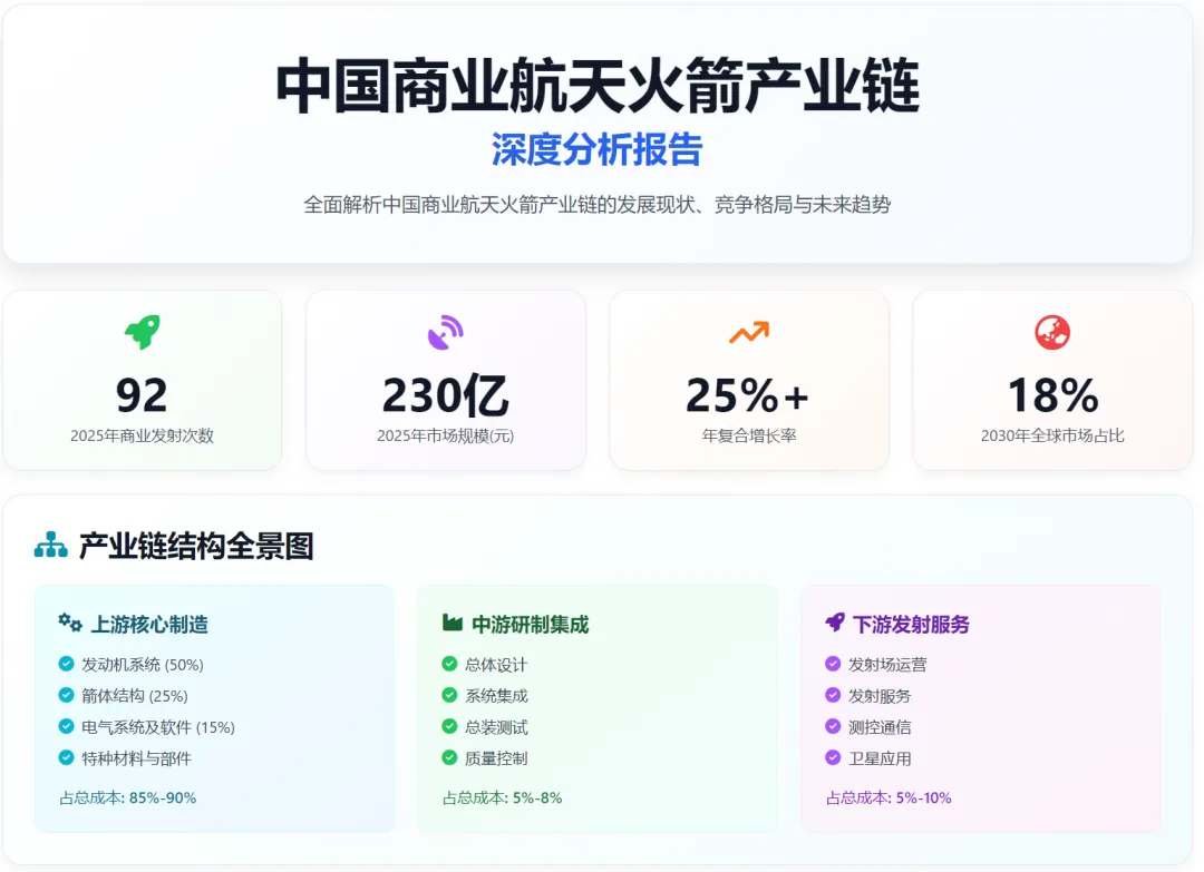 本报告旨在全面分析中国商业航天火箭产业链的发展现状、竞争格局和未来趋势,为产业参与者提供决策参考。报告采用 "纵向分解 横向对比的分析框架,纵向按价值链环节进行细分,横向对中国与国际企业进行竞争格局分析。