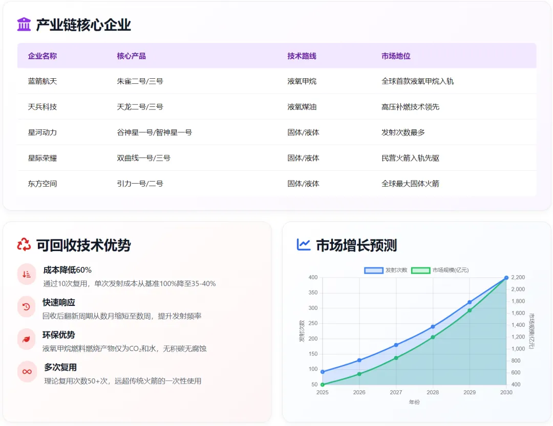 具体分析维度包括:产业链结构分析(上游原材料与核心部件、中游制造集成、下游发射服务)、技术路线对比(液氧甲烷 vs 液氧煤油、可回收技术)、市场格局分析(主要企业市场份额、地域分布)、成本结构剖析(传统火箭 vs 可回收火箭)、以及未来发展趋势预测。通过多维度、系统性的分析,为投资者、企业决策者和政策制定者提供全面的产业洞察。