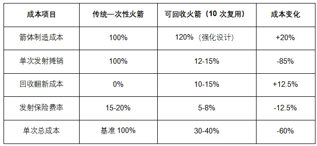 从成本结构的变化可以看出,可回收技术通过复用箭体结构、发动机等核心部件,直接摊薄单次发射成本。传统火箭发射中,箭体制造成本占比高达 70%,而可回收技术通过重复使用一级火箭、整流罩等核心部件,将单次发射成本降低 70% 以上。
