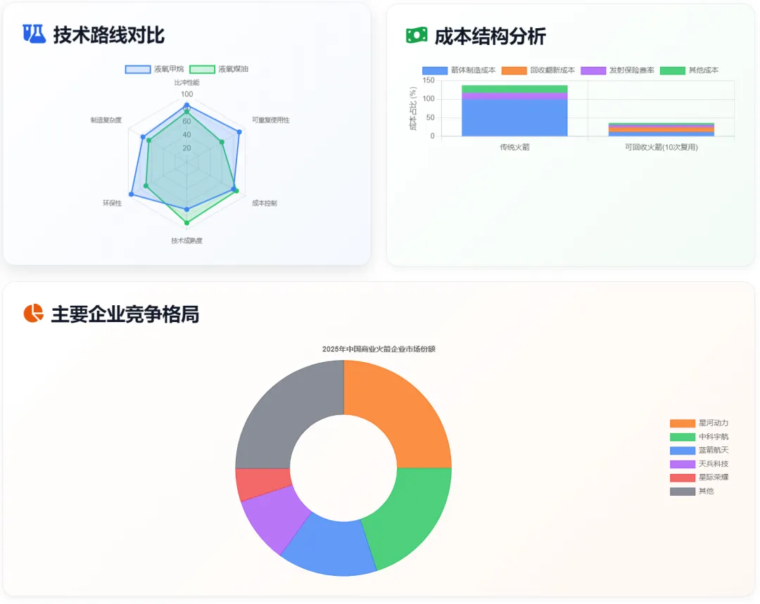具体分析维度包括:产业链结构分析(上游原材料与核心部件、中游制造集成、下游发射服务)、技术路线对比(液氧甲烷 vs 液氧煤油、可回收技术)、市场格局分析(主要企业市场份额、地域分布)、成本结构剖析(传统火箭 vs 可回收火箭)、以及未来发展趋势预测。通过多维度、系统性的分析,为投资者、企业决策者和政策制定者提供全面的产业洞察。