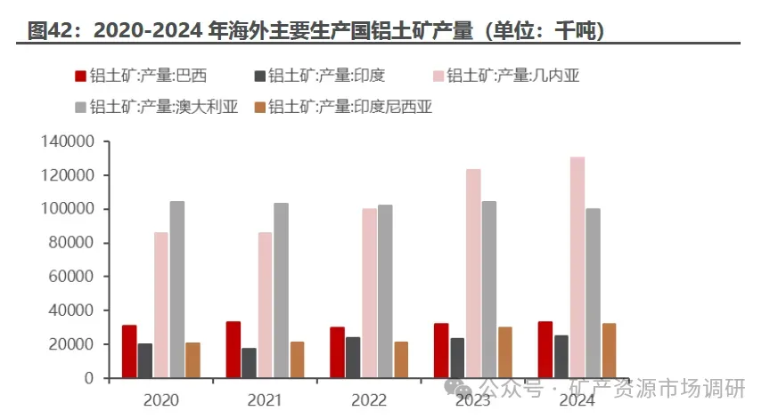 几内亚作为重要的资源型国家,铝土矿产量持续增加。 几内亚为全球第一大铝土矿生产国,近五年产量持续增长, 2024 年产量 1.3 亿吨,同比增长 5.7% 但由于所处地理位置的气候拥有长达半年的雨季,对铝土矿的开采和运输上造成了极大的困难。 2023 年底,几内亚境内曾发生大型燃油仓库爆炸事故,同时当地出现一部分罢工行为,未知的波动因素使得几内亚铝土矿供应面临不确定性。澳大利亚铝土矿产量较为稳定,近几年产量保持在 1.0 亿吨上下。印尼铝土矿产量增长较快,从 2020 年的 0.21 亿吨增至 2024 年的 0.32 亿吨,但由于禁止出口, 对我国供应影响不大。