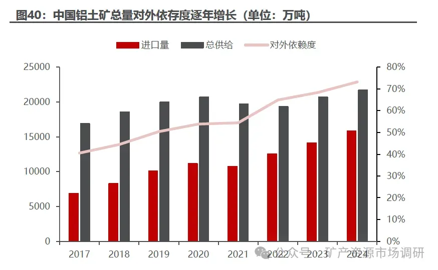 海外铝土矿弥补国内缺口,中国铝土矿进口规模逐年增长。202 4 年中国铝土矿进口总量约 1.59 亿 吨,同比增长 12.3 %%,总供给量 2.17 亿吨,202 4 年铝土矿对外依存度高达 73 。中国铝土矿低储高产的模式导致自给率不足问题逐渐显现,201 7 202 4 年我国铝土矿对外依存度 持续 上 升 ,尤其 202 4 年铝土矿进口量约为国内年产量的 3.7 倍。