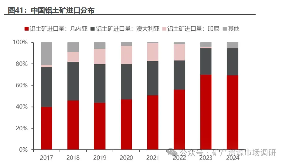 我国铝土矿进口主要来源为几内亚、澳大利亚。据海关总署数据统计, 2024年我国从几内亚进口铝土矿 11054 万吨,同比增长 11.3%11.3%,占总进口的比例为69.7%69.7%,从澳大利亚进口铝土矿 3989 万吨,同比增长 15.3%15.3%,两者进口占总进口的 94.8% 。近几年,几内亚作为我国铝土矿第一大供应国,进口量呈现持续增长趋势。由于 印度尼西亚于 2023 年 6 月执行铝土矿出口禁令 ,印尼对中国铝土矿出口断崖式下滑,导致我国铝土矿进口来源结构逐步向几内亚倾斜。