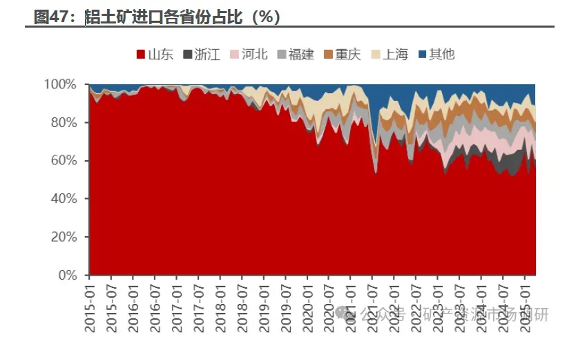 各地区氧化铝厂对进口铝土矿的依赖程度存在显著差异。山东、重庆、河北等地的氧化铝厂 几乎 完全依赖进口矿石,相较之下,贵州和云南的氧化铝厂主要依赖国产矿石,山西、河南和广西虽仍主要使用国产矿石,但进口矿石的占比 有所提升表明这些地区在国产矿石供应不足时,逐步增加了对进口矿石的依赖。 从全国范围看,进口矿石在全国氧化铝生产中发挥着重要作用。