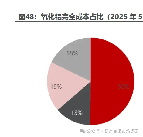 ◆ 氧化铝成本受铝土矿涨价影响小幅增加。氧化铝完全成本由铝土矿、烧碱、能源和其他费用组成,生产1吨氧化铝,大概需要2.1-2.7吨铝土矿(不同品位矿石吨耗差别较大)、0.3-0.5吨 、0.12-0.14吨烧碱和0.2-0.9吨石灰。截止2025年5月底,各项成本占比分别为49%、13%、20%和18%,占比最高的为铝土矿,其次是能源。