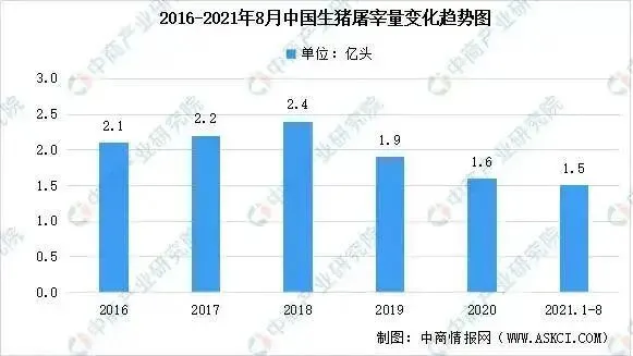 2021年以来,在猪价及肉价均下滑的情况下,生猪屠宰量被赋予期待。数据显示,我国生猪屠宰量较为波动,2018年达到最高值2.4亿头。2020年我国生猪屠宰量达1.6亿头,同比下降约15%。2021年第一季度,我国规模以上生猪屠宰企业屠宰量0.5亿头,同比增39.1%;1-8月,全国规模以上生猪定点屠宰企业屠宰量1.5亿头,同比增长56.4%,增长幅度逐渐扩大。