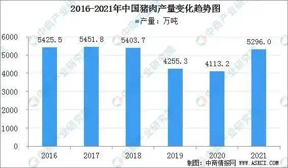 2021年以来,随着前期稳产保供各项政策措施成效进一步显现,新增、改扩建养殖场生猪产能持续释放,生猪生产快速恢复。2020年,全国猪肉产量4113万吨,比2019年减少142万吨,下降3.3%。2021年一季度猪肉产量1369万吨,同比增加31.9%,猪肉产量快速增加,也是导致2021年来猪肉价格持续下降的主要原因之一。2021年二季度生猪供应量将恢复到2017年底的水平。2021年上半年,猪肉产量2715万吨,增加717万吨,增长35.9%。2021年全年共产猪肉5296万吨,同比增加38%。