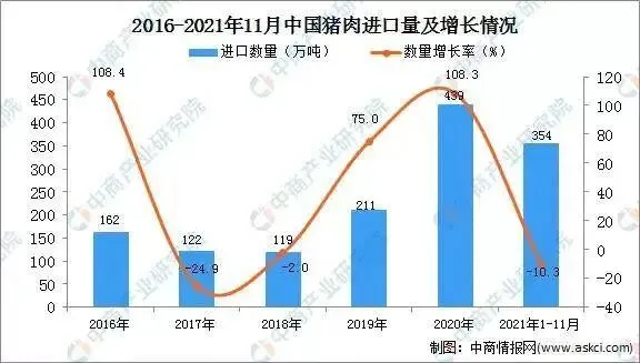 鉴于我国猪肉市场供不应求的局势,我国大量从国外进口猪肉,我国猪肉供应国主要以欧盟、巴西、美国等地区为主。另一方面,我国自国外进口猪肉具有关税方面的优惠。我国自2020年1月1日起,将冻结猪肉进口关税由12%暂时下调至8%,有利于增加猪肉进口量,有效缓解国内供应紧缺问题。另外冬季,肉类市场进入消费旺季阶段,肉类产品进口量也随之增加。2021年1-11月中国猪肉进口量354万吨,同比下降10.3%。