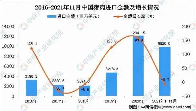 从金额方面来看,随着进口量的增加,猪肉进口金额也随之增加。2021年1-11月中国猪肉进口金额9820.0百万美元,同比下降8.7%。