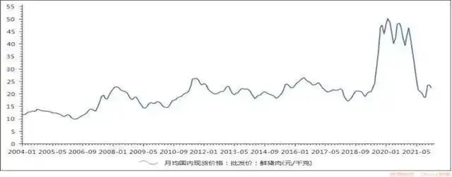 2021年以来猪肉价格一路走低。7月份,猪价基本稳定在成本线附近,略低于成本线,市场上活猪价格约每公斤15元,相比于年初的35.68元/公斤,下降57.9%。2022年1月国内鲜猪肉批发价为22.2元/千克。