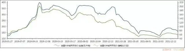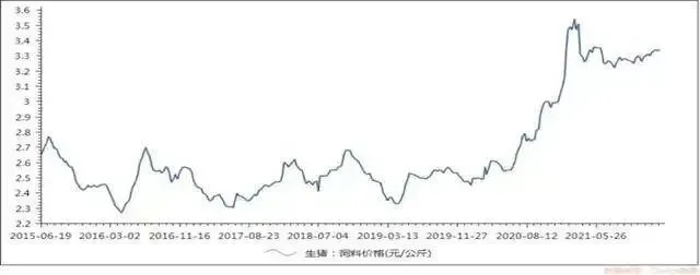 一般来说,如果饲料原料供应量相对稳定的话,原料价格应该与猪价成负相关。饲料原料主要是玉米、豆粕、麸皮。2022年1月24日的生猪饲料价格为3.34元/公斤,1月鲜猪肉的批发价为22.2元/千克。