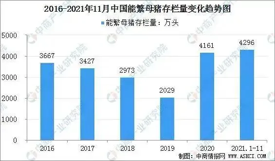 能繁母猪是生猪生产和市场供应的“总开关”。“有母就有小,有小不愁大。”只要能繁母猪存栏量变动不大,仔猪生产就有保障,生猪市场供应和猪肉价格就能保持相对稳定。2021年11月末我国能繁母猪存栏量为4296万头,相当于正常保有量的104.8%,产能正常波动,处于绿色区域。此外,2021年11月末我国能繁母猪存量环比下降1.2%,同比增长4.7%。
