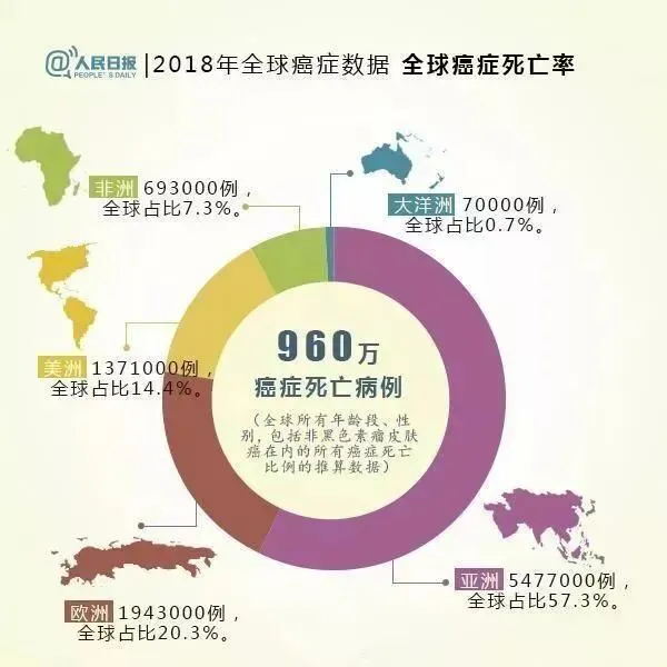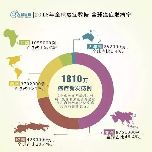 根据全球癌症年报数据可知,2018年全球有1810万癌症新发病例和960万癌症死亡病例,全球所有年龄段、性别,包括非黑色素瘤皮肤癌在内的所有癌症发病比例的推算数据。