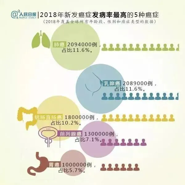 全球新发癌症发病率最高的依次为:肺癌(11.6%)、乳腺癌(11.6%)、结肠直肠癌(10.2%)、前列腺癌(7.1%)、胃癌(5.7%);