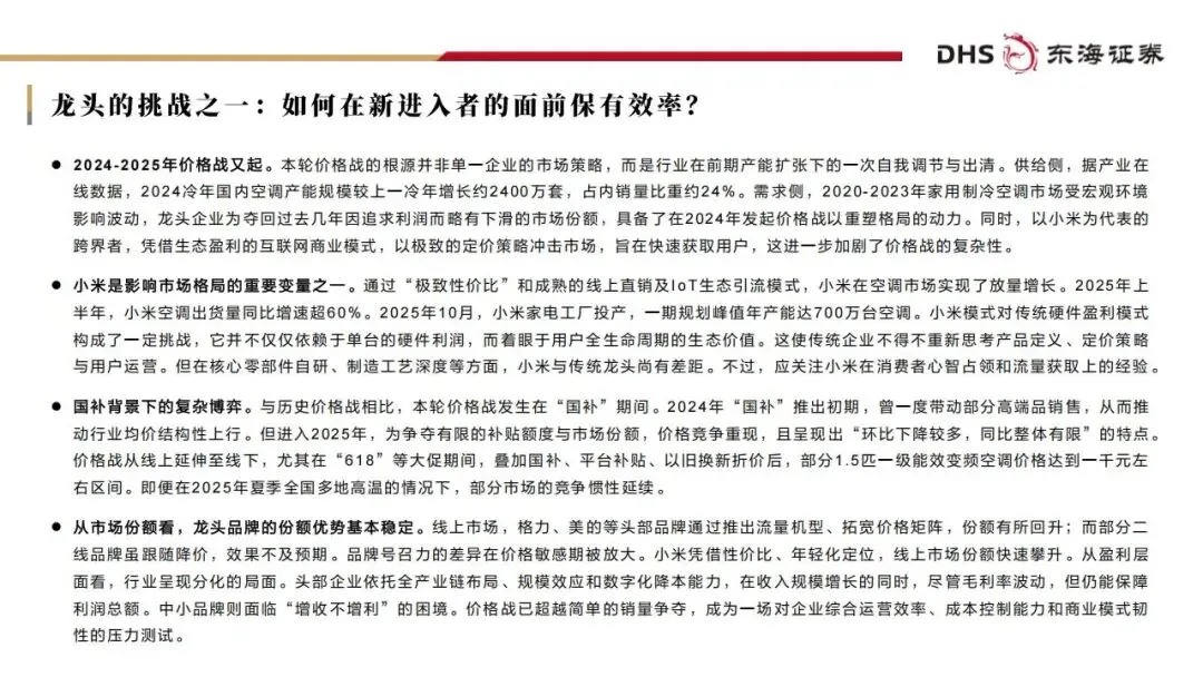 小米凭借互联网商业模式和极致性价比,2025年上半年空调出货量同比增速超过60%。更重要的是小米正在补齐制造短板,其家电工厂一期规划峰值年产能已达700万台。这种不完全依赖硬件利润、看重全生命周期生态价值的打法,对传统家电企业构成了实质性挑战。