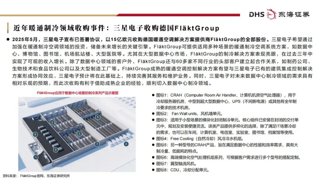 三星电子在2025年5月砸下15亿欧元,全资收购了德国的FläktGroup。这笔交易的核心逻辑在于FläktGroup在数据中心制冷领域的积累,它能提供从CRAH(机房空气处理器)到风机墙的一整套方案,且已拥有60多家头部客户。三星此举意在将自身的建筑控制方案与FläktGroup的技术结合,切入高增长的数据中心市场。