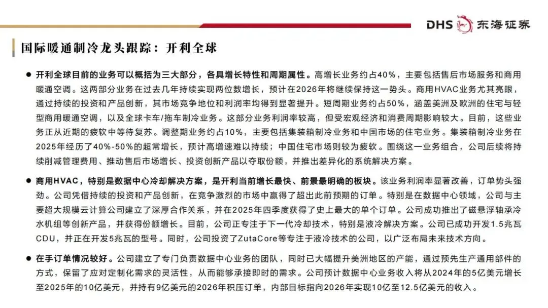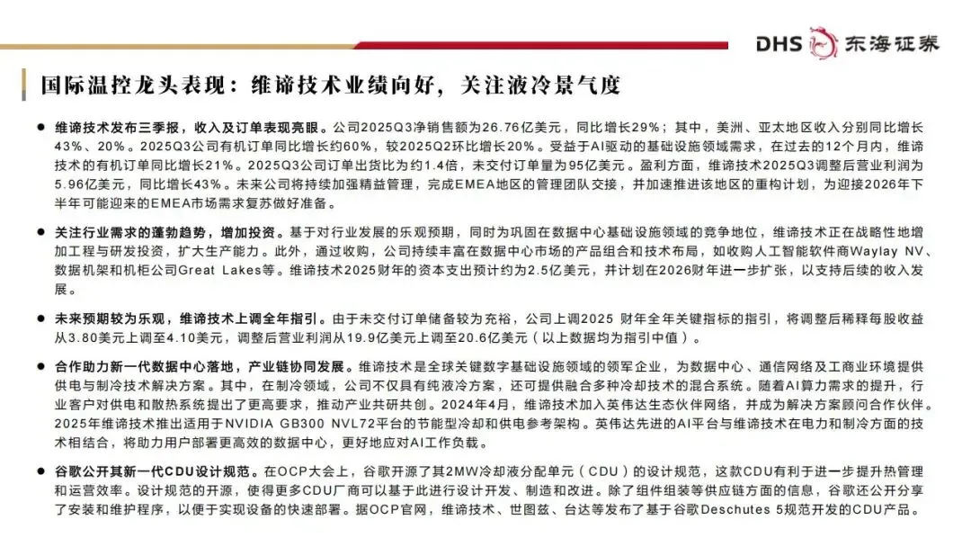 海外巨头的数据验证了这一赛道的火热。维谛技术(Vertiv)2025年第三季度有机订单同比增长约60%,未交付订单高达95亿美元。开利全球(Carrier)预计其数据中心业务收入将从2024年的5亿美元增长至2025年的10亿美元,并在2025年四季度拿下了史上最大的单个订单。